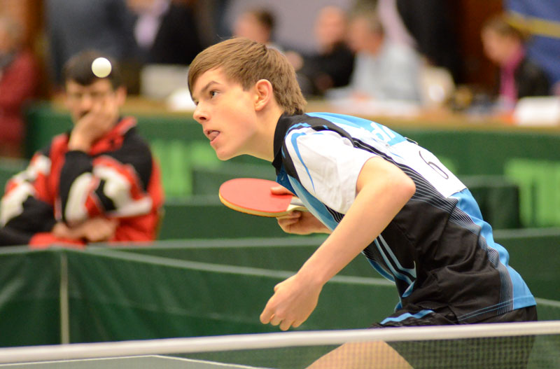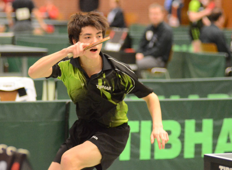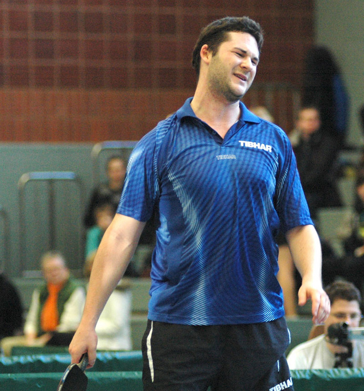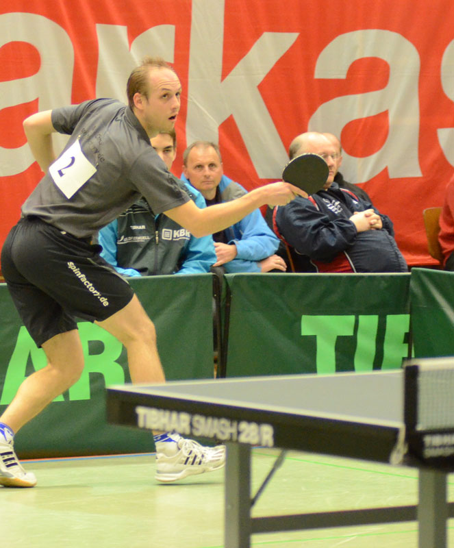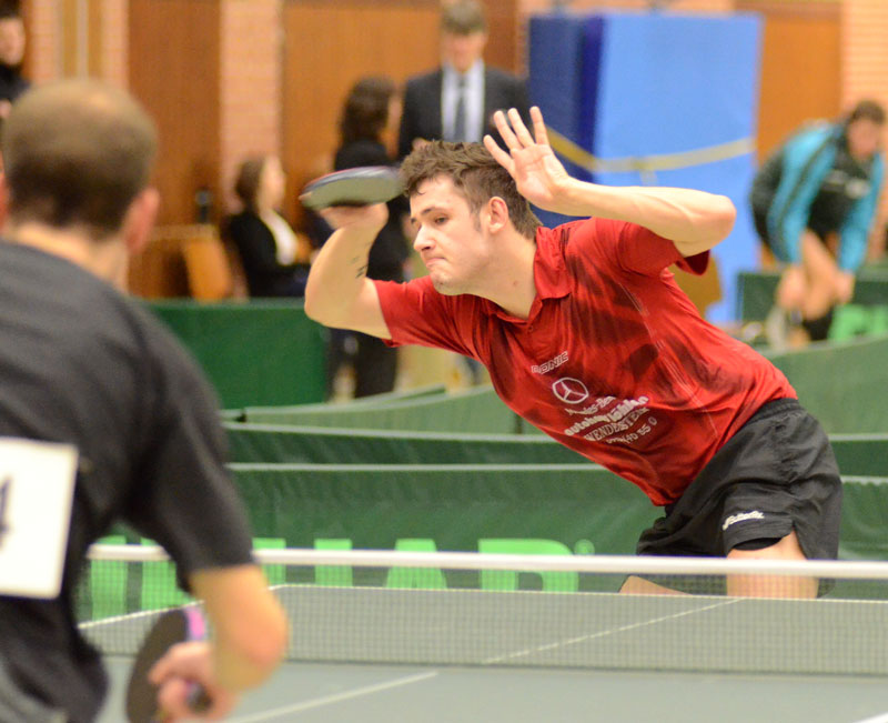 Erstmals allerdings siegte Christ im Trikot des TV Hilpoltstein, der – beim weißblauen Championat mit seinem kompletten Zweitligateam vertreten – einen farblich kompletten Medaillensatz aus der Oberpfalz nach Mittelfranken davontrug. Verantwortlich für Silber: Dennis Dickhardt. Dabei schien der Neu-Bayer im Viertelfinale gegen Gregor Clemens Förster (TSV Bad Königshofen/Oberliga) bereits so gut wie aus dem Rennen: 8:11, 4:11, 8:11, 12:10, 12:10, 11:7 und 11:6 – manchmal sagen Zahlen mehr als Worte. Parallel hatte auch Alexander Flemming mit dem 16-jährigen Nachwuchs-Nationalspieler Florian Schreiner (SC Fürstenfeldbruck/Regionalliga) einige Mühe: Ein 4:2 nach 0:2 zu Gunsten des topgesetzten Hilpoltsteiners bedeuteten dessen Einzug in die Medaillenränge. Im Halbfinale kreuzten sich dann die Wege der beiden Freunde Dickhardt und Flemming. Dickhardt siegte 4:1, ehe er Christ in gleicher Höhe unterlag, Topfavorit Flemming musste sich mit Bronze begnügen.