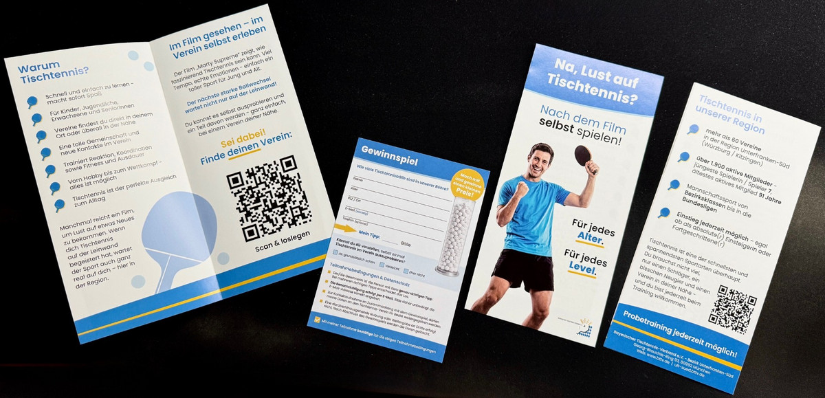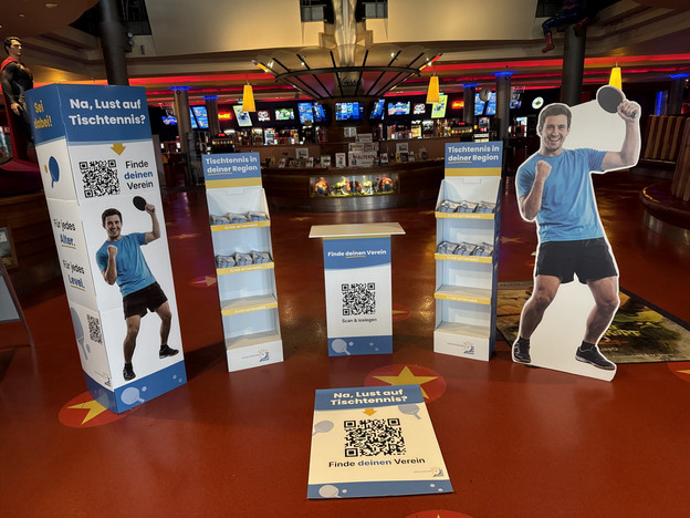 Vereinsservice-Fachwart Uli Müller stellte Kontakte zu den Vereinen her, warb für die Aktion und stieß auf Resonanz. Der RSV Frickenhausen, TSV Geiselwind, TSV Prosselsheim und TTC Theilheim werden am Wochenende in Kino die Gäste empfangen und für Tischtennis begeistern. Außerdem können sich die Besucher über Tischtennis informieren, es gibt einen Infostand mit Flyern samt QR-Codes zu den Vereinen in Unterfranken und ein Gewinnspiel. Dabei muss die Anzahl der Bälle in einer Ballsäule geschätzt werden. Die durch das Gewinnspiel entstehenden Kontakte (auf dem Gewinnspiel-Los mit der Schätzung ist u. a. die Frage formuliert: Können Sie sich vorstellen, mal selber zu spielen?") können sich die Vereine in Unterfranken-Süd wiederum selbst zunutze machen. Die Vereine, die vor Ort im Kino sind und sich engagieren, haben den kürzesten Draht und am schnellsten den Kontakt.